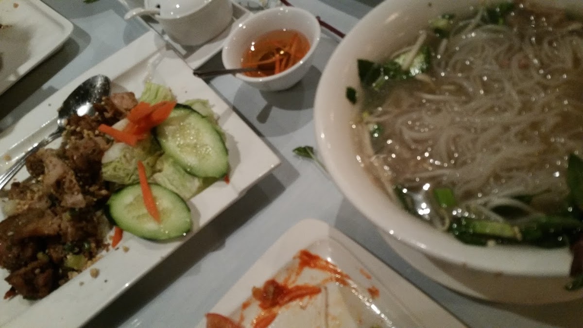 3.5 rounded up. Good casual lunch and I suppose dinner spot if you're in the area but probably wouldn't go out of my way to get here. I've only come for lunch since it's convenient and satisfies my Thai food cravings. Kao soi w/beef- tasty and big portion, however, the beef was a bit tough and there wasn't enough. I ordered from the regular (not the lunch) menu and it didn't say the beef was an extra $1 but it showed up on the bill. I do love the crunchy noodles on top and the noodles really soak up the sauce. Kao soi w/chicken- flavor is consistent with the beef kao soi and consistent with the amount of meat as well (not much). I think I slightly prefer the chicken over the beef though since the chicken wasn't as tough and no extra mark up. I'd get this again. Fresh spring rolls- tasted as fresh as it sounds. Came with 4 pieces and I liked the peanut dipping sauce it came with. Wouldn't mind getting this again. Chicken satay- this also came with 4 pieces and peanut sauce with some sweet pickled cucumbers. The cucumbers were a bit too sweet for me and the chicken was a bit too dry. I'd probably pass on this in the future. Shaking beef- tasty, tender, big portion, ordered from regular menu to share family style but it comes as a lunch special with rice.